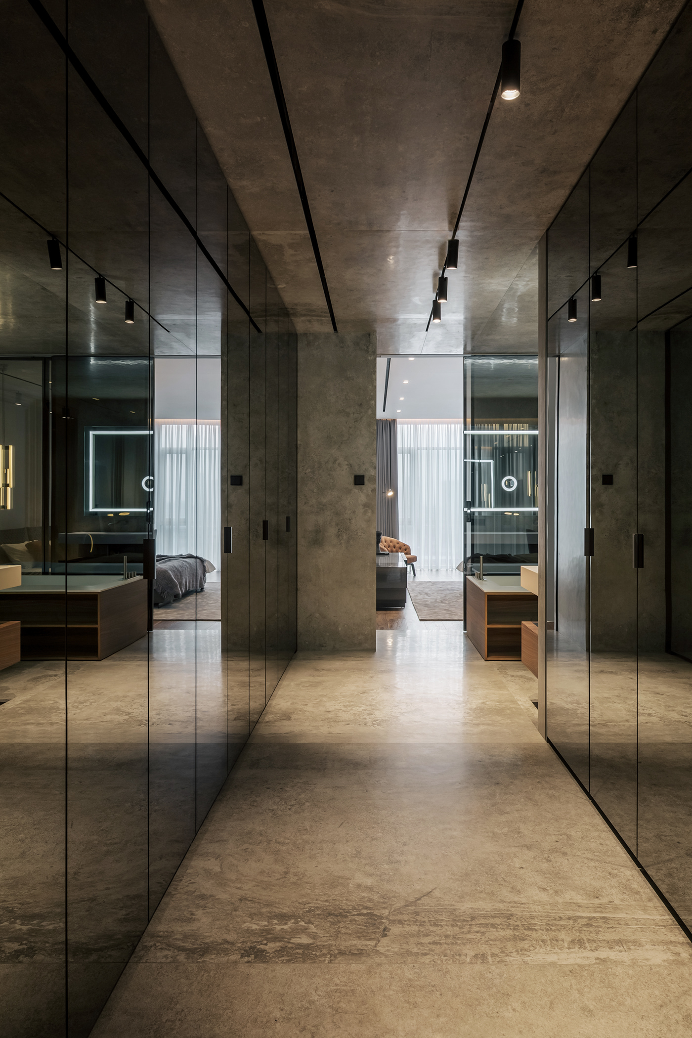 卧室展现出纯粹的简约,较低的棕色床铺受到现代亚洲风格的影响,2×2m 的床垫底座提供了足够的自由度。深褐色的木质地板,带来温暖的感觉,中和了白色墙面的冷酷感。这套设计的另一个亮点是卫生间,浴缸旁边的一整面玻璃推拉门设计,从卫生间往外看视觉极佳,整面墙黑科技灯带化妆镜,在浴缸里边泡澡边追剧,舒适体验卸下一天疲惫。