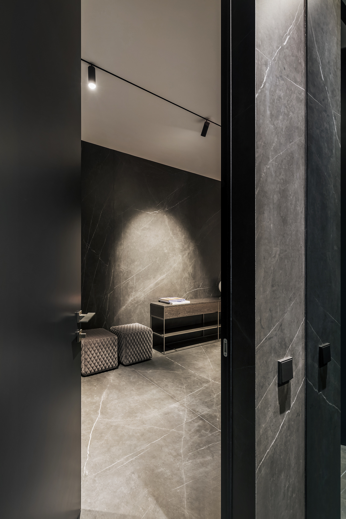 整体定位是灰白调现代轻奢风格,设计师在设计的时候既保留公寓原有灵魂和强烈的建筑元素,同时又增添了独属于现代与个人的风格。在装修公寓时应舍去硬质的隔断,采用软隔断来对空间进行划分,比如,用藤艺的屏风、书架或是隔断墙就能划分出功能区。设计师将这套公寓多余的墙全部打掉,利用镜面和透明玻璃,增加整体通透感,提高视觉空间感。客厅通过木质纹路吊顶、镜面墙将开放厨房、客厅、餐厅分割开来,做颜色区分,让整体即统一每个功能区又各具特色。有些人在装修的时候,觉得纯白墙面过于单调空旷,其实挂上大幅有特色的油画,艺术气息一下就会提升不少。